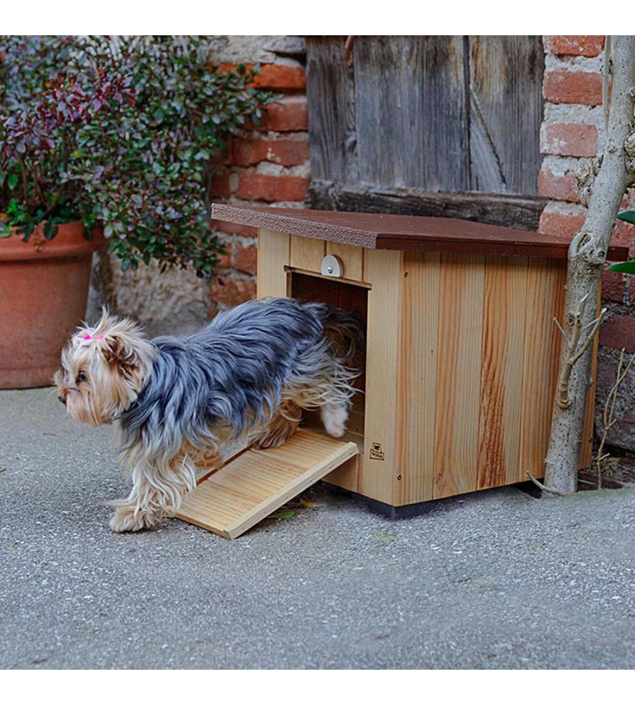 Compatta e funzionale, la casetta Baita 40 è perfetta per piccoli cani o conigli. Realizzata in legno di pino nordico certificato FSC, proviene da foreste gestite in modo sostenibile ed è trattata con vernice impregnante ecologica, atossica e antimuffa, resistente ai raggi UV e all’acqua. Ideale per l’esterno, offre comfort in ogni stagione al tuo animale domestico. È dotata di piedini in plastica per un ottimo isolamento dal terreno e di tetto piatto in plastica, removibile per facilitare la pulizia e utilizzabile come area realx. La porta d’ingresso con struttura a gradini funge anche da scaletta e dispone di blocco di sicurezza. La griglia di ventilazione superiore assicura una buona ventilazione interna, mantenendo l’ambiente asciutto e salubre.