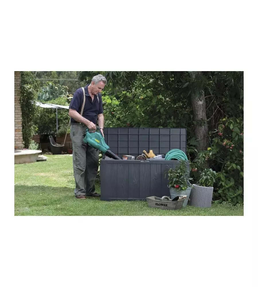 Baule da esterno keter "sherwood" in resina grafite effetto legno 270 lt 117x45x58 cm