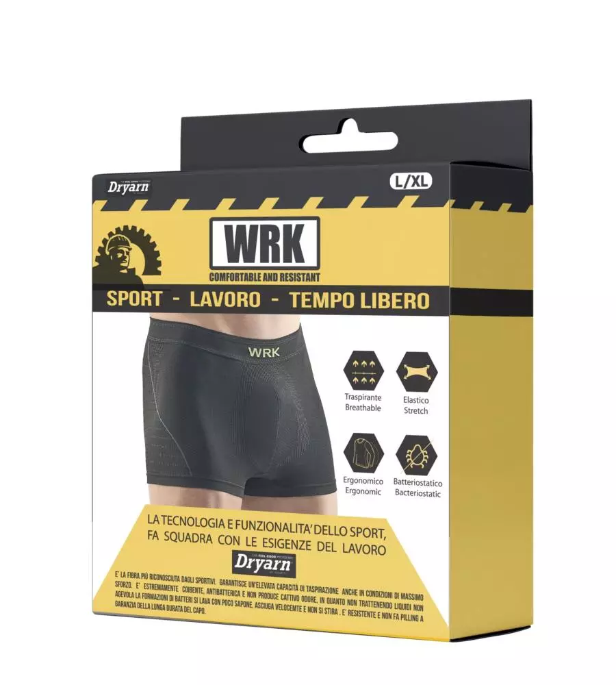Boxer uomo tecnico di colore nero dotato di cuciture piatte grazie alla tecnologia Seamless. Dispone di costruzione ergonomica che assicura una perfetta aderenza senza creare fastidi. Possiede sezioni traspiranti per garantire la massima performance. Il boxer tecnico da uomo di WRK è batteriostatico, ergonomico, resistente, elasticizzato e traspirante. È realizzato interamente in Dryarn, un filato innovativo ed altamente performante capace di assicurare il massimo confort, tecnologia e praticità a chi lo indossa. Il boxer tecnico "WRK202" è leggero ed isolante, ideale per mantenere la pelle sempre asciutta garantendo un effetto "seconda pelle". La composizione del boxer è 70% polipropilene, 20% poliammide e 10% elastan.