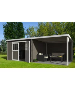 La casetta da esterno è realzzata in legno di abete del nord, durevole e resistente. La casetta da giardino è realizzata da tavole con linguetta e scanalatura da 28 mm. La casetta in legno ha un tetto a una falda, ricoperto in carta catramata per evitare infiltrazioni. La casetta in legno è inoltre dotata di una porta con serratura e di finestre per lasciar passare la luce al suo interno. La casetta da giardino possiede una tettoia laterale integrata che può fungere da gazebo e offre un piccolo rifugio accogliente per rilassarsi all'aria aperta.