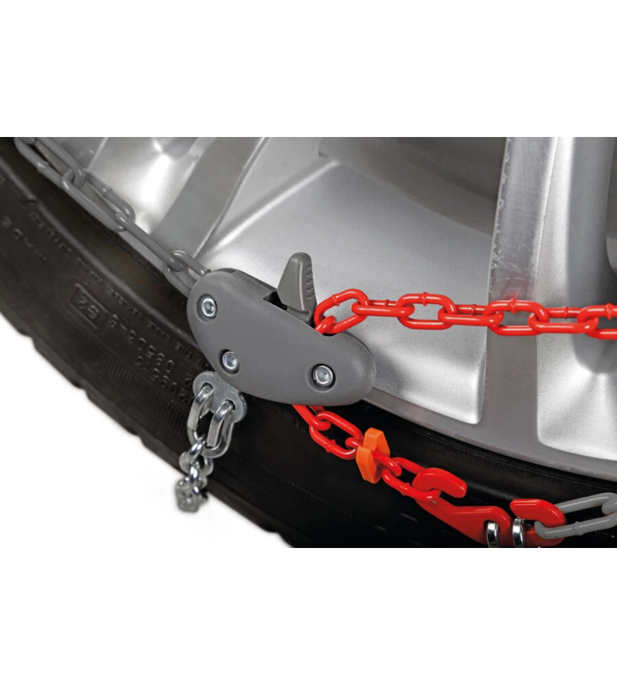 Le catene da neve a montaggio esterno rappresentano la soluzione ideale per vetture non-catenabili o con limitazioni di ingombro, tipiche dei modelli sportivi di ultima generazione. Fissate ai bulloni esagonali originali del cerchio, offrono zero mm di ingombro interno. Grazie agli elementi di regolazione, si adattano perfettamente a diverse misure di pneumatico. Il battistrada, costituito da un monoblocco di catena circolare senza giunzioni, è sostenuto da 4 piastre in resina plastica con inserti rompighiaccio in acciaio temprato. Omologate secondo gli standard ÖNORM V 5117 - EN 16662-1, queste catene presentano un pratico sistema di tensionamento con tirante in gomma, garantendo un montaggio facile e veloce senza sforzi.