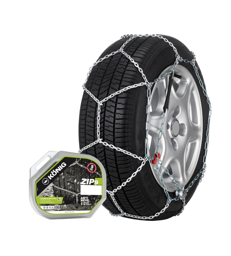 Le catene da neve Konig Zip 9 - Codice misura 100, Made in Italy, sono compatibili con pneumatici da 195/80 R15 a 235/35 R19, incluse misure specifiche come 215/60 R16 Bridgestone Duravis. Con soli 9 mm di ingombro, sono ideali per auto con spazio limitato tra ruota e passaruota. Il sistema di tensionamento manuale con impugnatura anatomica consente un montaggio rapido e una facile ritensionatura dopo pochi metri di guida. Grazie al cavo interno flessibile, l’installazione avviene senza dover spostare il veicolo. Il battistrada a rombo in acciaio speciale e le maglie a sezione a D assicurano una presa efficace sulla neve. Le maglie regolabili permettono un adattamento preciso a diverse misure e un utilizzo da entrambi i lati. Omologate secondo le normative italiane ed europee, garantiscono massima sicurezza in condizioni invernali.