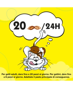 Ingredienti: Estratti di proteine vegetali, cereali, carni e derivati, oli e grassi, sostanze minerali, latte e derivati del latte (di cui 4% formaggioRazione giornaliera: Dare fino a 20 pezzi al giorno. Da consumare entro 4 giorni dalla data di apertura della confezione
