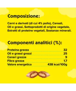Composizione: Carni e derivati (35%)* - (*equivalente al 50% di carni e derivati reidratati, con min. 26% Carni, min. 1% Pollo e min. 1% Tacchino), Cereali, Oli e grassi, Estratti di proteine vegetali, Sostanze minerali, Zuccheri, Lieviti, Pesci e sottoprodotti dei pesci, Latte e derivati del latte (0,3% polvere di formaggio*) - (*equivalente a min 1% formaggio reidratato).