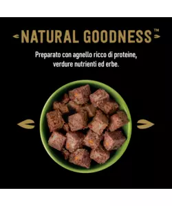 Carni e derivati* (57%, di cui agnello 14% e fegato 4%), verdure* (di cui carote essiccate 0.62%, equivalentea carote 4.8%, patate essiccate 0.38%, equivalente al 1.6% di patate e spinaci essiccati 0.15%, equivalente a spinaci 1.4%),sottoprodotti di origine vegetale*, sostanze minerali, rosmarino*, prezzemolo*. *ingredienti naturali.