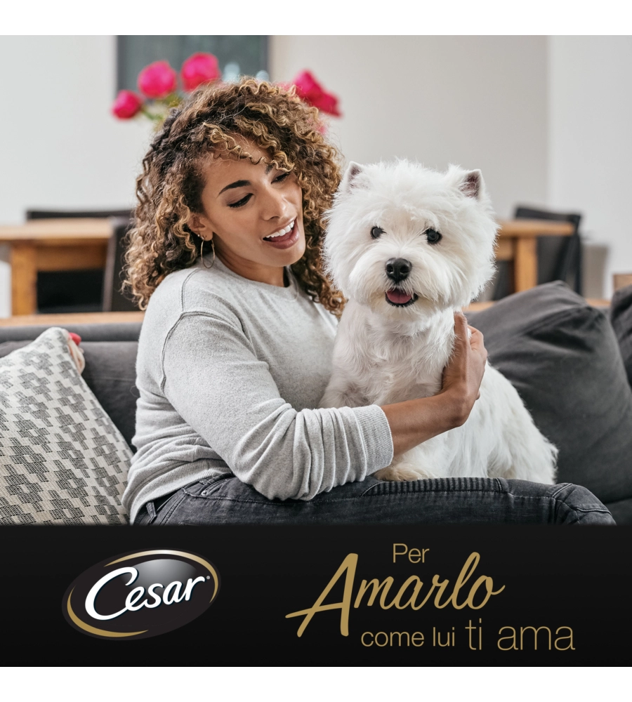 Un cane di 5 kg necessita di 1½; buste e di 50 g di alimento secco al giorno, un cane di 10 kg necessita di 3 buste e di 70 g di alimento secco al giorno, un cane di 15 kg necessita di 4 buste e di 95 g di alimento secco al giorno. Si raccomanda di dare un mix di alimento completo Cesar umido e secco. Lasciare sempre a disposizione dell'acqua fresca. Servire a temperatura ambiente. Una volta aperto, conservare in frigorifero per 2 giorni.