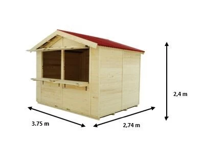 Chiosco in legno in legno massello non trattato. Chiosco dal design semplice e moderno, perfetto per mercatini, bar, spiagge, piscine e giardini. Le dimensioni esterne totali sono di 375 x 274 cm, mentre l’area interna utile è di 7,93 m², offrendo spazio sufficiente per molteplici utilizzi.