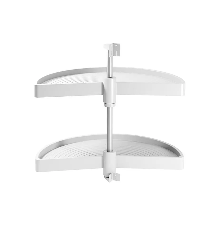 Cestelli girevoli mezza luna progettati per ottimizzare lo spazio in moduli ad angolo di cucina a forma di L. Sono facili da installare e adattabili a diverse altezze dei moduli.
