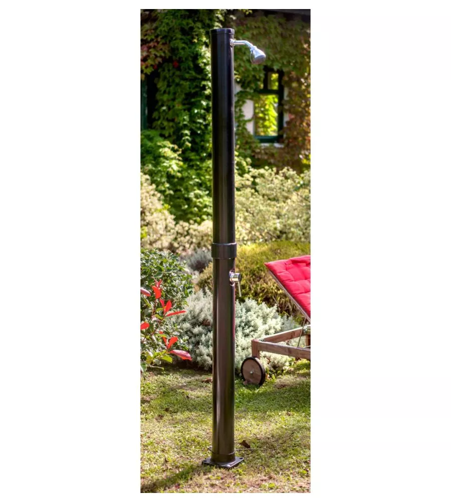 L'elegante doccia solare rotonda di Gre offre un modo pratico per goderti una doccia calda all'aperto utilizzando l'energia solare. Il riscaldamento dell'acqua avviene tramite un serbatoio di accumulo in alluminio da 20 litri, che sfrutta l'energia solare per riscaldare l'acqua in modo efficiente ed ecologico. Dotata di un monocomando per regolare la temperatura dell'acqua tra calda e fredda, la doccia solare offre un'esperienza personalizzata e confortevole. Il doccino è orientabile, consentendoti di dirigere il getto d'acqua esattamente dove desideri. La doccia è composta da due pezzi smontabili, in modo da poterla agevolmente riporre l'inverno.