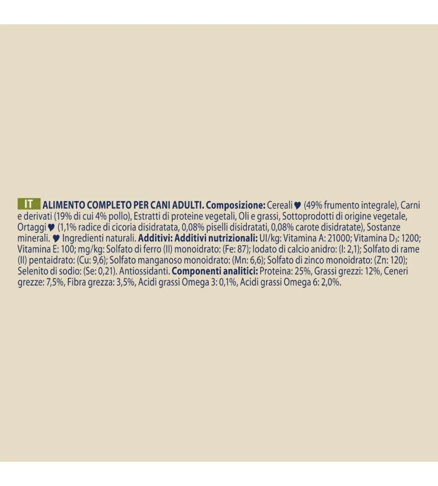 Cereali (49% frumento integrale), Carni e derivati (19 %di cui 4% pollo), Estratti di proteine vegetali, Oli e grassi, Sottoprodotti di origine vegetale, Ortaggi (1,1% radice di cicoria disidratata, 0,08 piselli disidratati, 0,08 carote disidratate), Sostanze minerali. Ingredienti naturali.