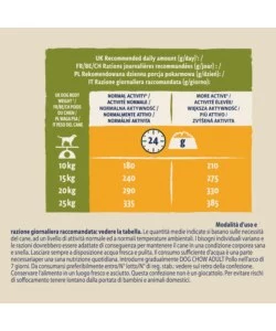 Peso corporeo: | Attività normale - quantità:| Attività elevata - quantità: 10kg | 180g |210g 15kg | 240g |275g 20kg | 290g |330g 25kg | 335g |385g.