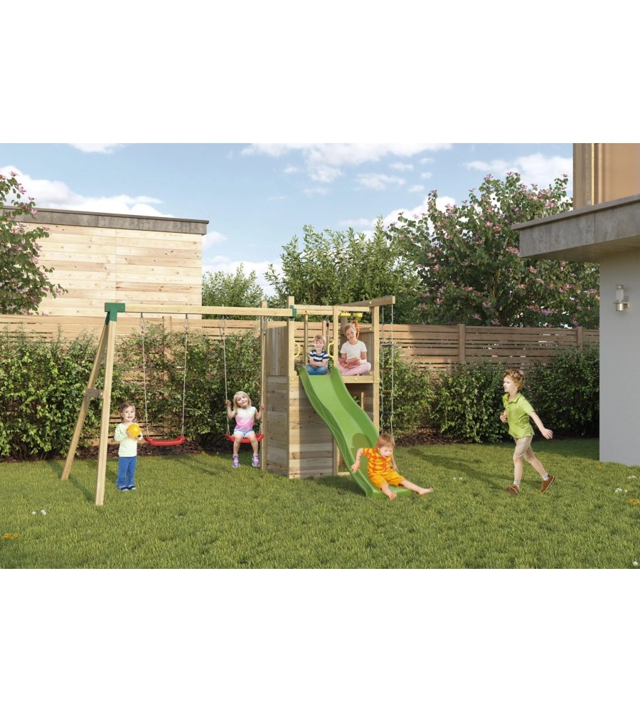 Gioco per bambini da esterno in legno fungoo "houser" con torretta, 2 altalene, corda da arrampicata e scala in corda 343x363x220 cm