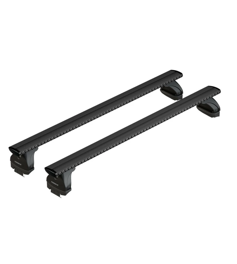 Barre portatutto realizzare da un robusto profilo in lega di alluminio verniciato a polvere, con predisposizione per connettori rapidi "T" nella scanalatura superiore. Il profilo frontale in gomma è studiato appositamente per eliminare l'effetto di risonanza dei flussi d'aria ed amplificare l'efficienza aerodinamica e funzionale del profilo alare oltre che a conferire un design innovativo e distintivo all'auto. Le barre portatutto dispongono di un nuovo sistema brevettato "press-to-open" che permette l'inserimento dei connettori rapidi a "T" senza dover rimuovere io terminale. Presentano un profilo in gomma per sigillare la scanalatura dopo il montaggio. La scanalatura inferiore, invece, per l'inserimento e scorrimento a scomparsa degli attacchi del piede. Scala graduata di posizionamento per un montaggio semplice e veloce.