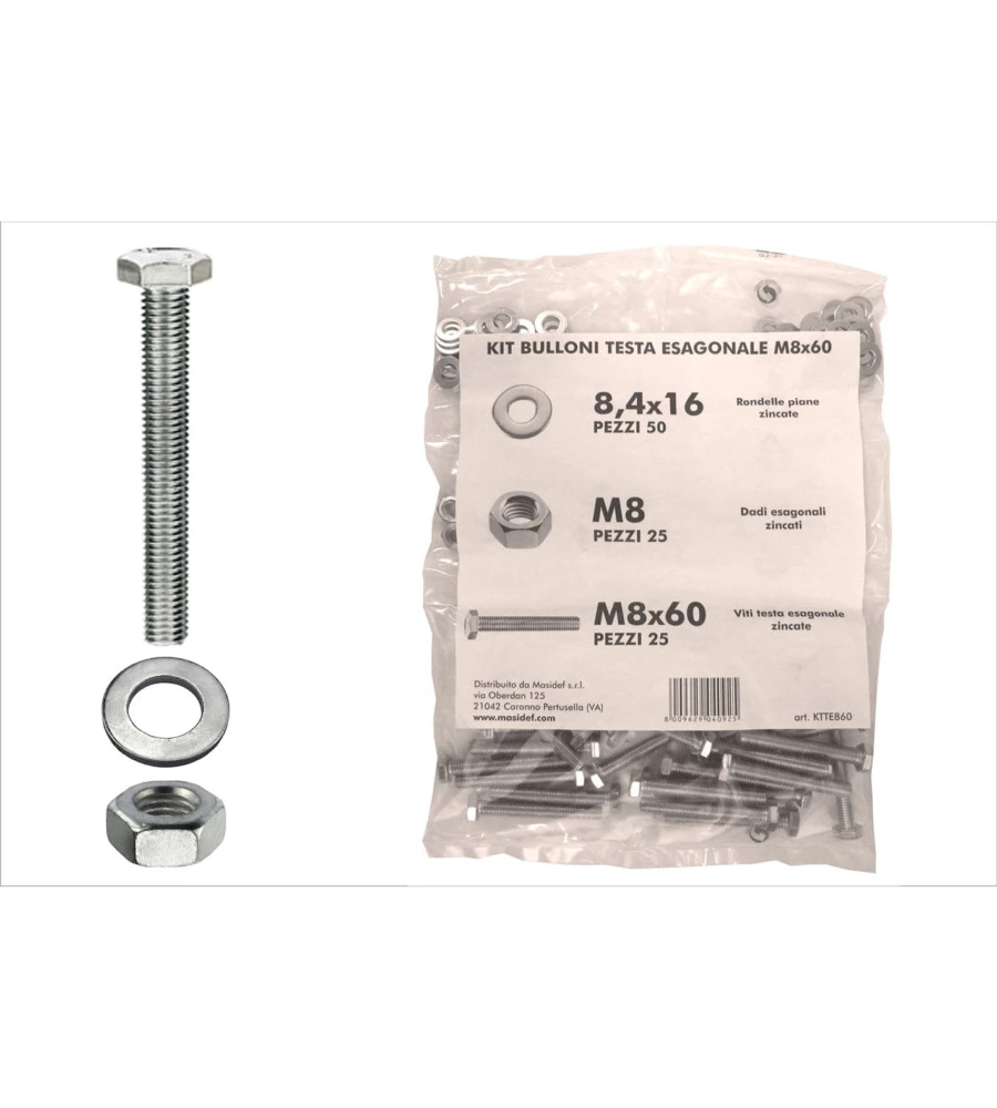 Kit viti testa esagonale m8 x 60 + dadi + rondelle - 100 pz.