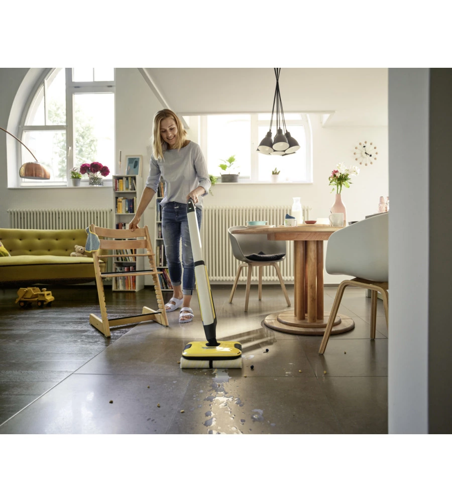 Lavapavimenti Kärcher FC 7 Cordless raccoglie lo sporco quotidiano sia asciutto che umido in una sola passata. Anche peli e capelli vengono raccolti senza problemi grazie al pratico filtro. La lavapavimenti FC 7 Cordless ha due serbatoi: uno per l'acqua pulita e uno per quella sporca. I rulli vengono costantemente bagnati con acqua pulita mentre l'acqua sporca finisce direttamente nel serbatoio dedicato. Il volume dell'acqua e la velocità di rotazione dei rulli possono essere regolati su due livelli di pulizia per adattarsi al tipo di pavimento. Autonomia di circa 45 minuti. Il display LED a tre stadi funge da indicatore intuitivo del livello della batteria. Segnale visivo e acustico per indicare il serbatoio d'acqua pulita vuoto e quello dell'acqua sporca pieno. Dotato di funzione di pulizia del dispositivo e del rullo. Pulizia semplice del filtro.