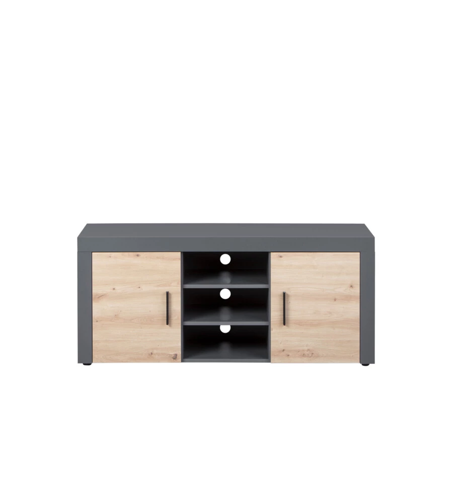 Mobile porta tv con struttura grigia e ante rifinite effetto quercia.