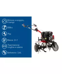 Equipaggiata con un motore da 208 cc, offre una potenza meccanica di 7 hp e una potenza nominale di 5220 W. Funziona a benzina, con un serbatoio del carburante che ha una capacità di 3,6 litri. Il carter della fresa è realizzato in acciaio, garantendo robustezza e durata nel tempo.