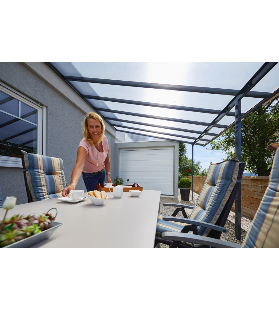 Pergola da esterno "Patio" in alluminio antracite e policarbonato trasparente, 4x4 metri.