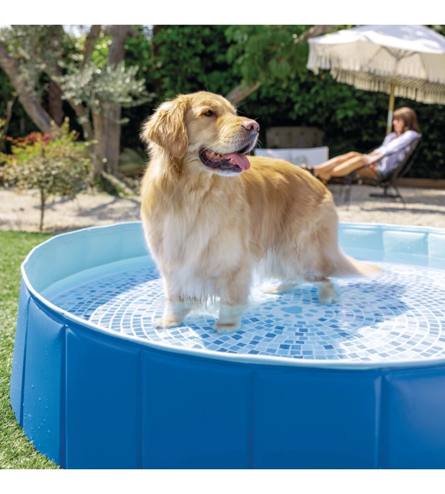 Con un diametro di 152 cm e un'altezza di 30 cm, la piscina è studiata per permettere al cane di entrare e uscire con facilità. La capienza di 492 litri garantisce spazio sufficiente per il massimo comfort. Il fondo è decorato con un elegante motivo a mosaico che rende l’acqua di un azzurro intenso, creando un effetto visivo piacevole e invitante.