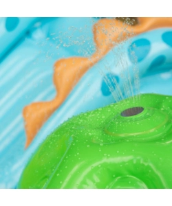 Fai divertire i tuoi bambini e rinfresca i loro caldi pomeriggi estivi con il fantastico Play Center Dinosauri! Ti basta gonfiarlo, con una pompa manuale o elettrica, per poi riempirlo d'acqua fresca. La piscina gonfiabile è prodotta in vinile resistente, spesso ben 0,28 mm, ed è composta da una vasca ovale, con vivace stampa a tema dinosauri. Il Play Center include: un mini scivolo acquatico a forma di dinosauro azzurro, con tappetino morbido imbottito alla base, per consentire ai tuoi bambini di scendere in sicurezza; bordo gonfiabile con dettaglio vulcano; una palma con irrigatore a spruzzino, collegabile al tubo da giardino, per rinfrescare i piccoli durante il gioco; un dinosauro gonfiabile in vinile. Il peso massimo supportato è di 54 kg. Capacità d'acqua al livello di riempimento suggerito di 12 cm: 143 L. Toppa di riparazione inclusa.