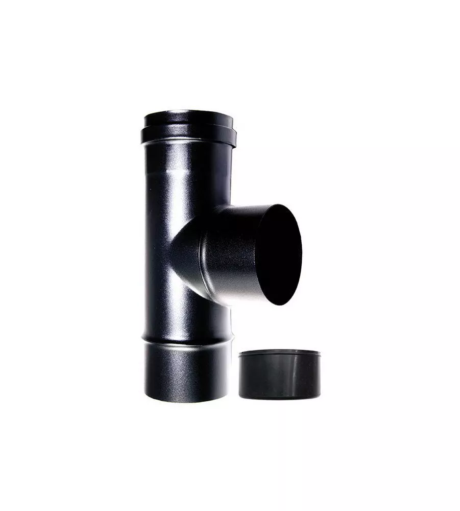 Raccordo caldaia a T 90 fm-m DN 100 ridotto 80 mm, per stufa a pellet o legna. Tubo nero in acciaio smaltato 600 gradi. CE Made in Italy. Viene fornito già comprensivo di tappo condensa chiuso in silicone che può essere utilizzato sia sulla parte maschio che su quella femmina. Elemento in acciaio al carbonio saldato a tig senza apporto di materiale ricoperto internamente ed esternamente con smalto vetroporcellanato cotto alla temperatura di 850°c, spessore totale (acciaio + smalto) 0,8 mm., massima resistenza alla corrosione e al fuoco da fuliggine interno, conforme alle norme UNI EN 1856-2:2009 e UNI/TS 11278:2008, classe di temperatura t200°c con guarnizione in silicone fornita a corredo. Adatto per l'utilizzo con stufe e caldaie alimentate a gas e pellet.