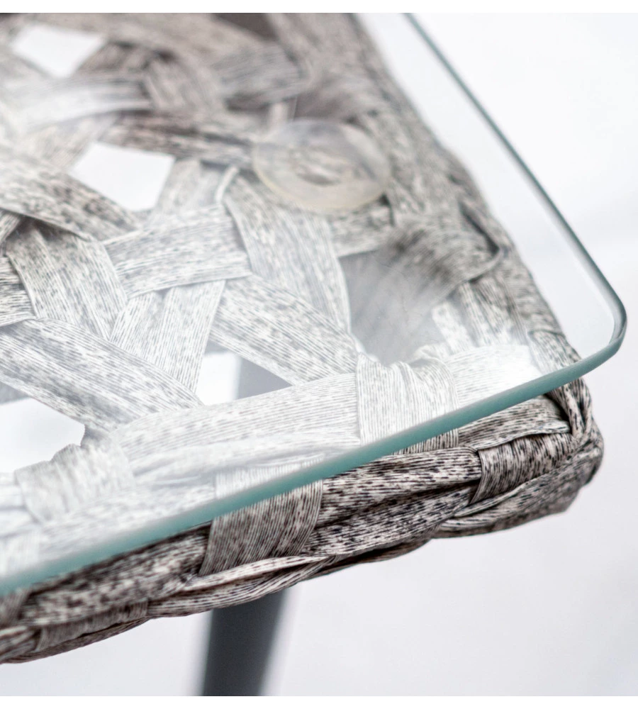Il set da esterno è composto da due poltrone ,un divanetto e un tavolino con top in vetro trasparente temperato.