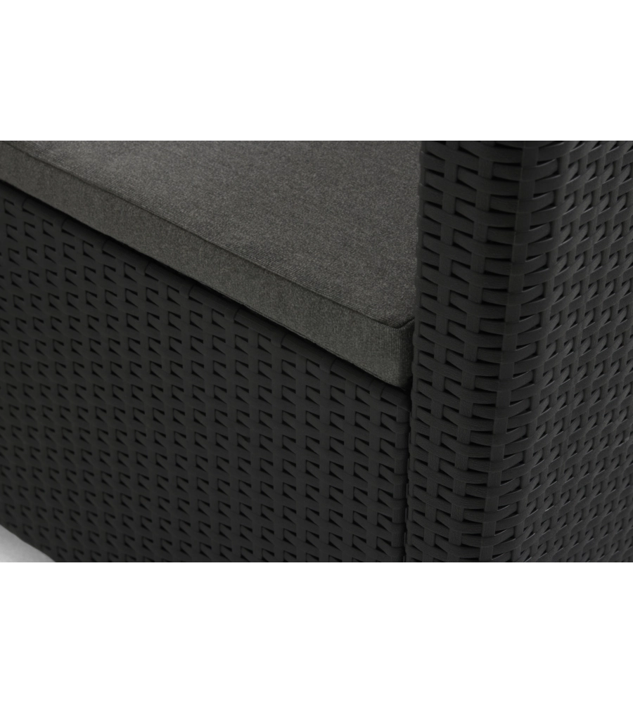 Set da giardino Keter "Emma Lounge" in polipropilene grafite, la soluzione ideale per chi cerca un salottino da esterno spazioso, confortevole e dal design elegante. Con le sue 5 sedute, è perfetto per condividere momenti di relax in compagnia su terrazzi, verande o in giardino. Il set da esterno è composto da un ampio divano a tre posti, due poltrone con braccioli e da un tavolino contenitore pratico e funzionale, dove riporre i morbidi cuscini grigi inclusi. Realizzato in polipropilene effetto rattan intrecciato, è resistente agli agenti atmosferici, facile da montare e da pulire. Il suo stile semplice ma raffinato si adatta facilmente a diversi ambienti esterni, valorizzandoli con discrezione.