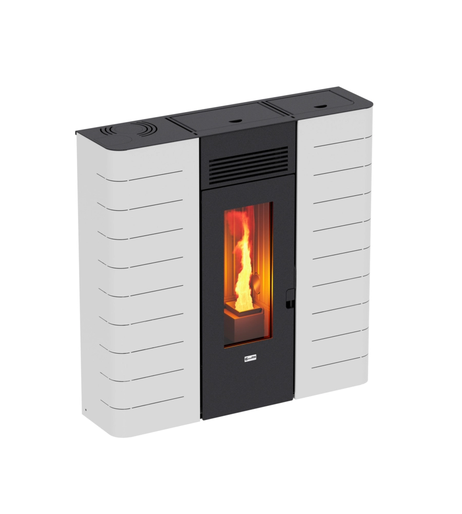 Stufa a pellet canalizzabile salvaspazio da 12kW di soli 25 cm di spessore, è la stufa ideale per ambienti ristretti o corridoi. Grazie alla possibilità di scarico fumi sia superiore che posteriore, può essere installata direttamente a filo muro. Posteriormente è presente un'uscita canalizzabile che permette di distribuire il calore facilmente anche in altri ambienti (lunghezza canalizzazione ottimale consigliata sino a 4 metri lineari). Con i suoi 12kW di potenza e una resa superiore al 95% è consigliata per riscaldare ambienti sino a 100m² (metratura riferita a un'altezza pavimento-soffitto di 2,7m).