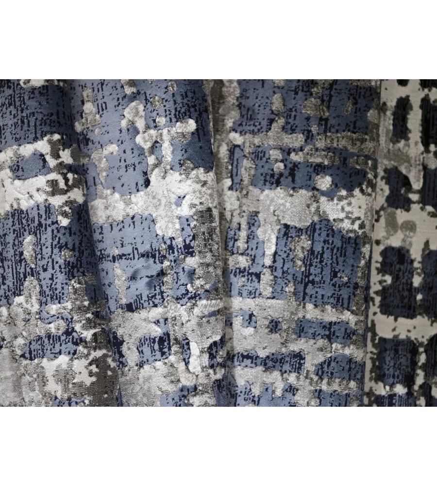 La base blu in varie sfumature si abbina perfettamente ai dettagli tridimensionali grigi che definiscono lo stile di questo tappeto.