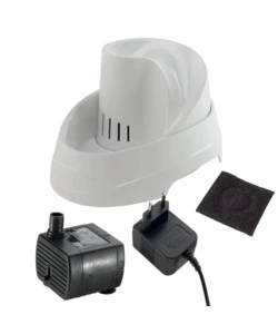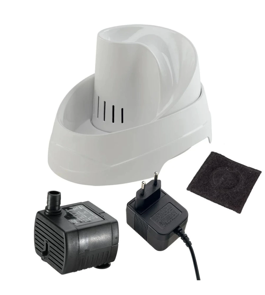 Fornita completa di filtro al carbone attivo per un'acqua sempre pulita e limpida, la fontanella per cani e gatti include una pompa ad alimentazione elettrica a bassa tensione (12V) con portata regolabile massimo 250 l/h e trasformatore compreso. Vega è inoltre facile da pulire grazie alla possibilità di estrarre la parte superiore dalla base.